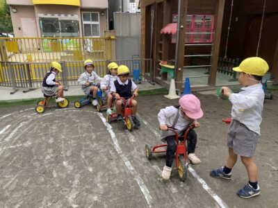 三輪車がずらりと並んでいますね。なんだか本物の道路みたい?子どもたちはいいアイデアを思いつきました。