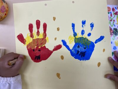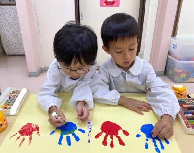 年長さんはカレンダー作りにもくもくと取り組んでいます。並んだ赤い手形と青い手形。クレヨンで何を描くのでしょう?