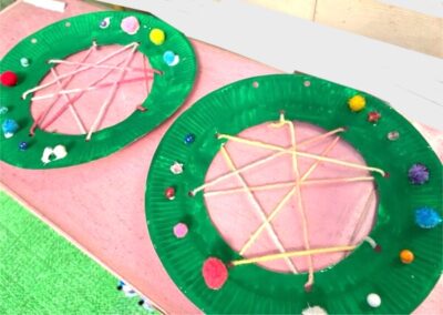 「白いところが無くなってきた!」「だんだんリースになってきたよ〜」と思い思いにお喋りを楽しみながら取り組んでいます。