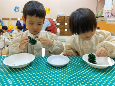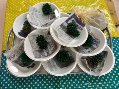 緑色の絵の具を塗った松ぼっくり。何に変身するのでしょうか?