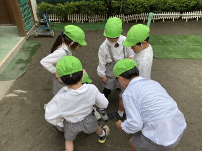 年長クラスでは鬼ごっこが大人気。誰が鬼になるか、足を合わせて『鬼きめ』で決めています。