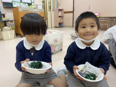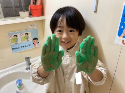 「緑の泡になっちゃった!」と手を洗いながら大はしゃぎ。製作中はもちろん、準備や後片付けの中にもたくさんの発見があります。子どもたちは『楽しい!』や『面白い!』を見つける名人です♪