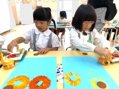 トイレットペーパーの芯を使ってスタンプした鮮やかなひまわりは、8月のカレンダーになります。この日は一日で三か月分のカレンダーを仕上げました☆