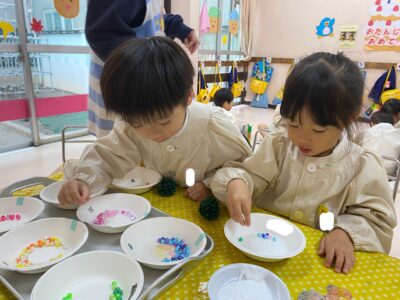 「どれにしようかな?」「キラキラしてる!」好きなビーズを選びます。