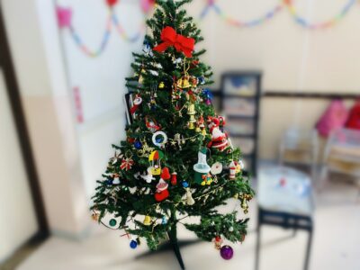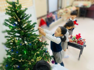 12月といえばクリスマス。年長さんのお部屋には大きな大きなクリスマスツリーが登場!飾り付けは子どもたちにしてもらいました。