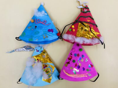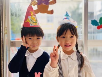 「できたよ〜!」クリスマス会でかぶるのが楽しみですね。