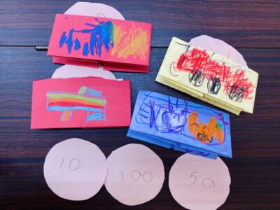 親子製作では、2学期末に行う「お店やさんごっこ」で使うお財布とお金を作りました。