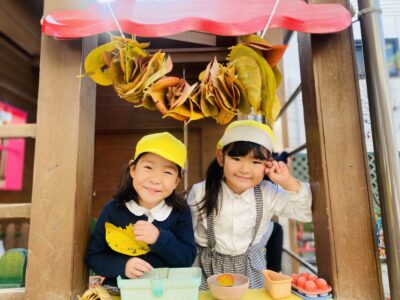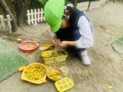 オレンジや黄色の落ち葉はおままごとにぴったりです。細かくちぎってお砂のケーキにかけたり、お茶碗によそったり。中にはバケツいっぱいに集めている子もいました。
