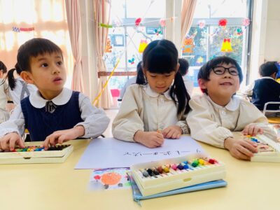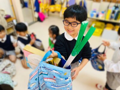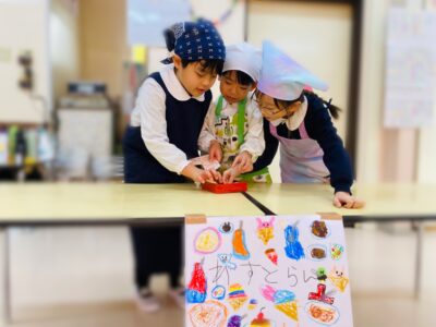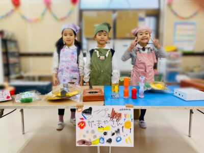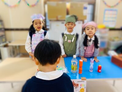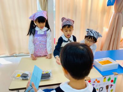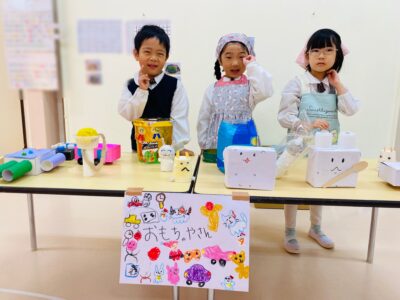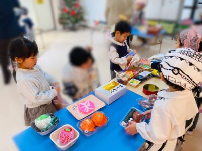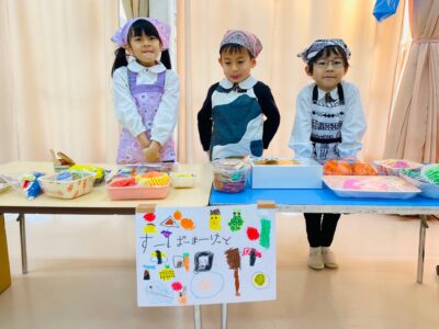 二学期の終わりに『お店やさんごっこ』を行いました。年長クラスの子どもたちが店員さんに、年中・年少クラスの子どもたちがお客さんになってお買い物を楽しみました。