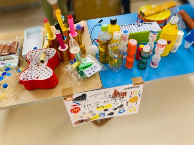 子どもたちの意見から生まれた楽器屋さん。カスタネットにハンドベルにマラカス。シンバル、ギター、太鼓などの大きな楽器もあります。どれも本当に演奏ができますよ♪