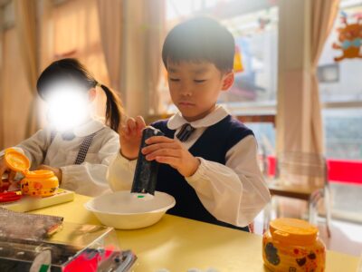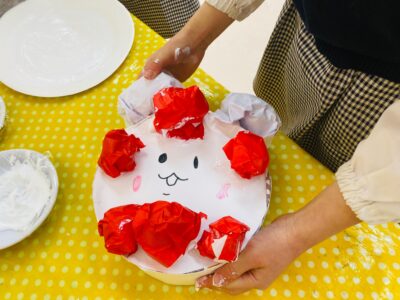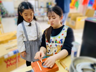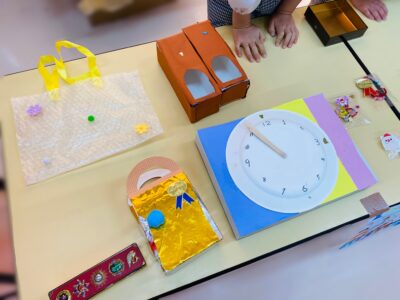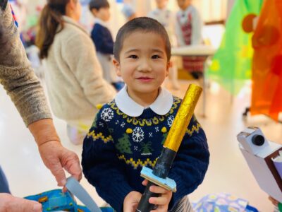 品物作りはできるだけ大人の手を入れずに『自分で考え自分で作る』ことを大切に進めていきました。「これを作りたい。どうやって作ろう?」と考える中で、工夫する楽しさや表現する喜びを味わう子どもたちの姿に、成長を感じます。