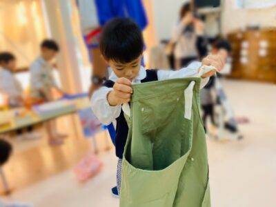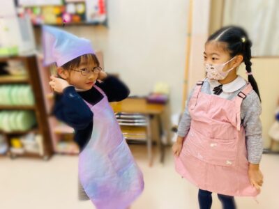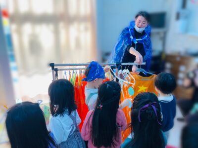 年中さんがやってきました。先生がマントを着ているのを見て興味を持った子どもたち。開店早々、お洋服屋さんには人だかりができていました。