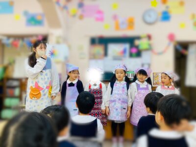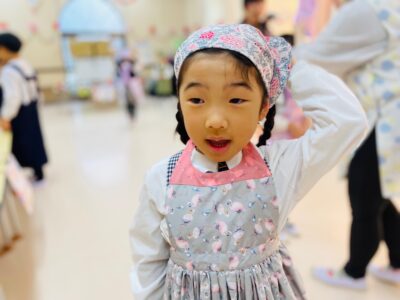 おうちから持ってきたエプロンと三角巾をつけて、やる気満々の子どもたち。