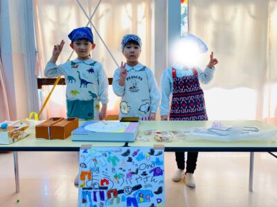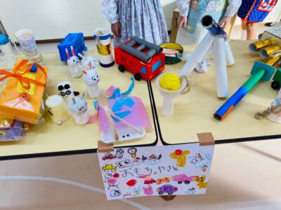 品物はみんなで協力して作り上げます。お菓子の空き箱、トイレットペーパーの芯、新聞紙。日常の中ではゴミとして捨ててしまう『廃材』を素敵な品物に作り変える子どもたちは、まるでマジシャンのようです。