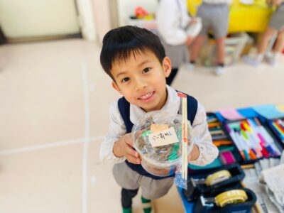 この日のためにお財布とお金を一生懸命作った年少さんたち。はじめてのお店やさんごっこでしたが、緊張することもなくどんどんお店を巡っていきます。