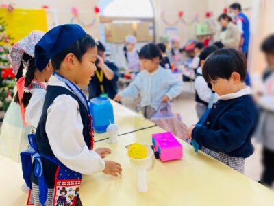 二学期の終わりに『お店やさんごっこ』を行いました。年長クラスの子どもたちが店員さんに、年中・年少クラスの子どもたちがお客さんになってお買い物を楽しみました。