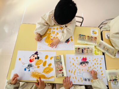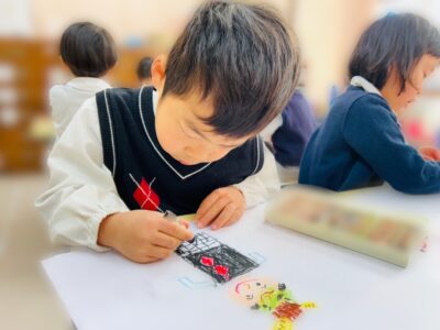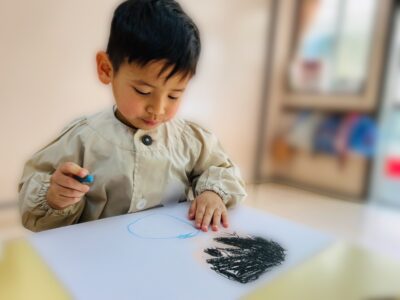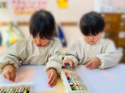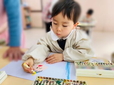 クレヨンを手に、画用紙に向かう姿は真剣そのものです。