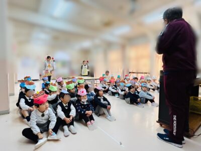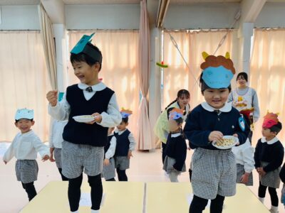 「なんで豆をまくのかな?」という先生の問いかけに、みんな静かに、そして真剣に耳を傾けていました。行事の意味を子どもたちなりにしっかり受け止めているようです。