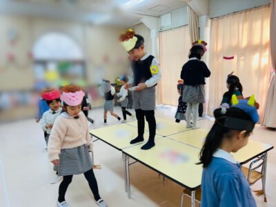 お部屋の真ん中に置かれた机にお当番さんが立ち、その周りを子どもたちが「鬼」になってぐるぐると逃げ回ります。