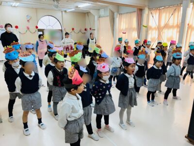 元気な歌声がお部屋の中に響き渡り、いよいよ豆まきへの準備は万端です。