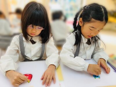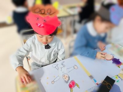 画用紙いっぱいに、豆をまいた時の様子や楽しかった場面がカラフルに描かれていきました。一人ひとり、感じたことが違う素敵な作品ばかりです。
