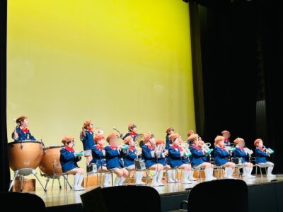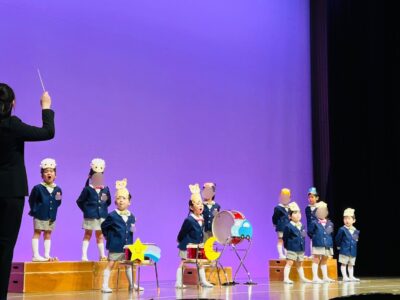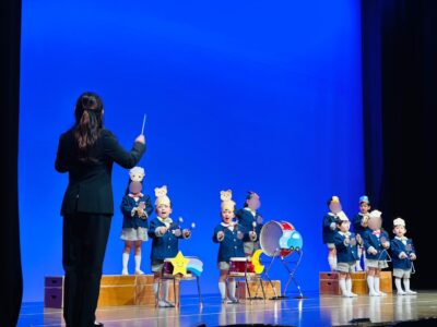 続いては年中さんの合奏です。4月から根気強く練習してきた「おもちゃのマーチ」。3学期からはティンパニや鉄琴など色んな楽器も加わり、1年間の積み重ねを感じさせる、深みのある合奏になりました。