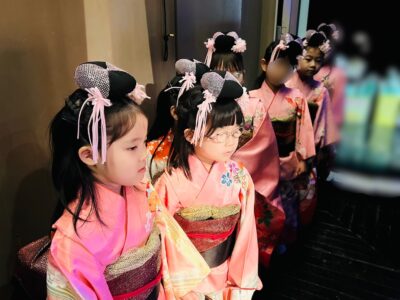 年少さんは、はじめての大きなステージにちょっぴりドキドキ。衣装に身を包んで、本番を待つ緊張気味のお顔も、この時期ならではの可愛らしさですね。