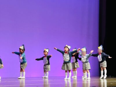 最後までリズムに合わせて、元気にステージを駆け回った年少さん。はじめてのお遊戯の発表、最後まで立派にやり遂げることができました。