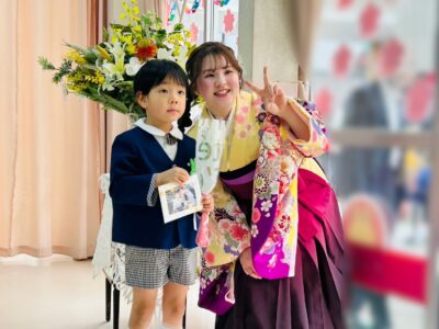 最後は大好きな担任の先生と並んでパチリ!「小学校でも頑張るね」と力強い約束を交わし、晴れやかな笑顔での門出となりました。