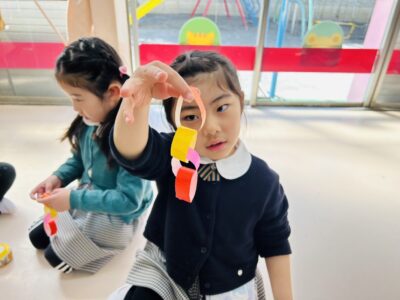「見て見て、こんなに長くなったよ!」と、出来上がった飾りを嬉しそうに見せ合い、お部屋がどんどん華やかになっていくのをみんなで喜び合いました。