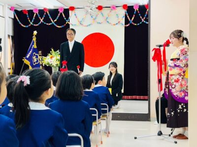 式が始まると、園長先生のお祝いの言葉を、背筋をピンと伸ばして聞く年長さんの立派な後ろ姿が見られました。